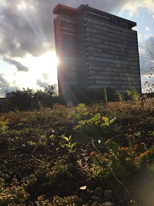 This 500 m2 roof can retain 30 000 liter. The roof is planted with herbs and vegetables. This is to find out which plants are growing well on the substrate and can occasionally survive some dry days.