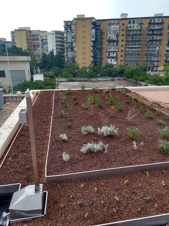 The climate in Palermo, just like Cagliari, is dry and hot in the summer. On the outer ring clover and sedum were sowed. In the inner ring oregano, narrow-leaved bindweed and shrubby bindweed were sowed. The university is interested in how the substrate and the plants on the polder roof influence the water quality of the water that percolates through the substrate.